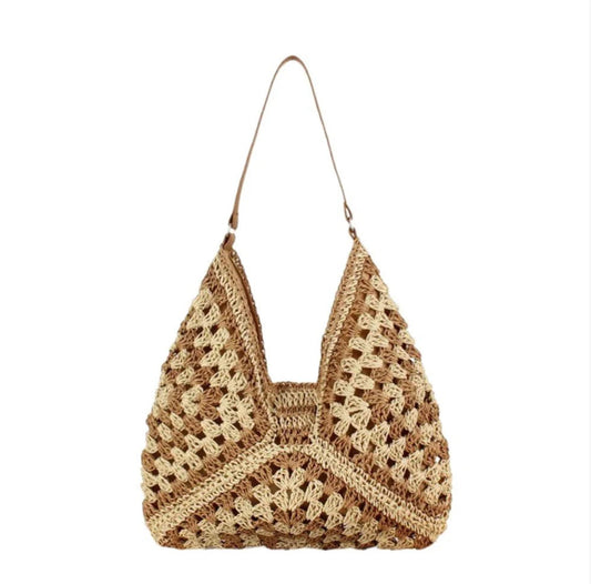 Bohemian Women's Straw Shoulder Bag – Elegant and Light, Light Brown and Black, 35 cm x 22 cm