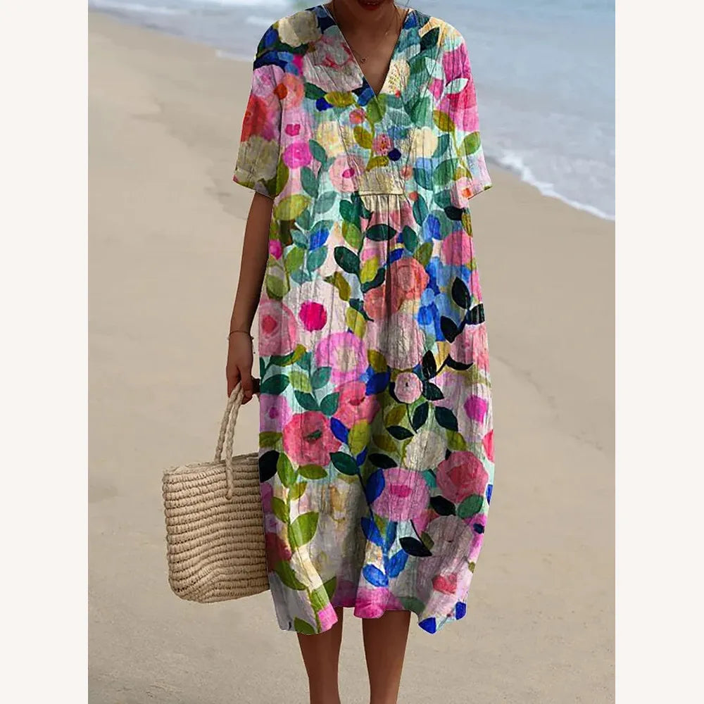 Robe d'Été Longue Femme en Coton, Coupe Décontractée et Encolure en V - Idéale pour les Journées Ensoleillées