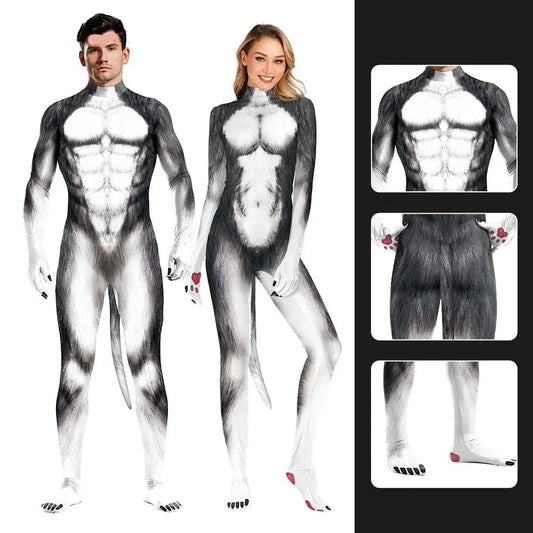 Unisex Husky Costume in Full Jumpsuit with Detachable Tail for Halloween and Cosplay