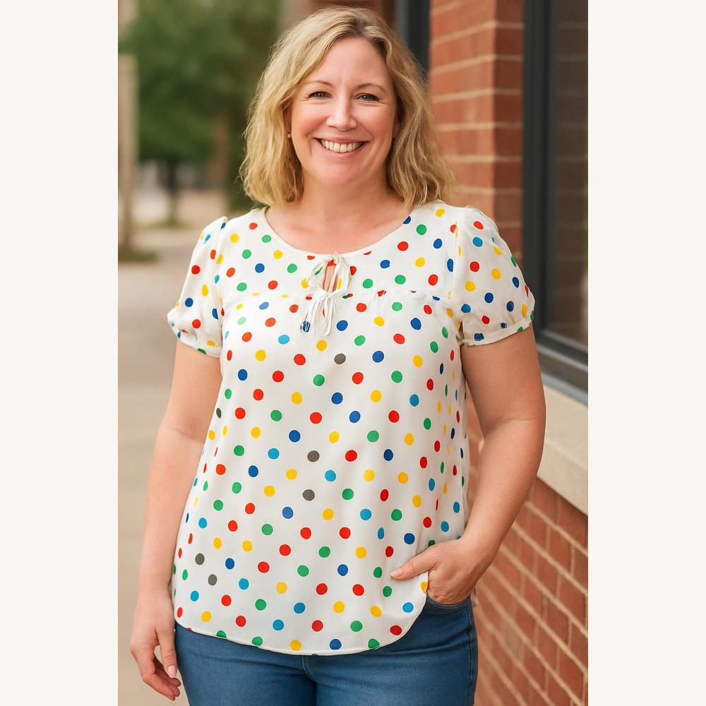 Women's Multicolored Polka Dot Blouse – Loose Tunic with Puff Sleeves and Tie Collar, Comfortable and Trendy