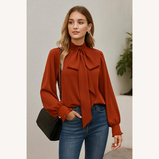 Chic Women's Blouse in Apricot Polyester with Bow Tie and Puff Sleeves – Elegant and Versatile