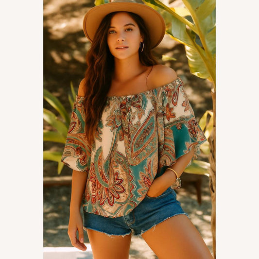 Top Bohemian Off-Shoulder Paisley Print – Lightweight and Airy Fabric for Women, Flared Short Sleeves, Ideal for Summer