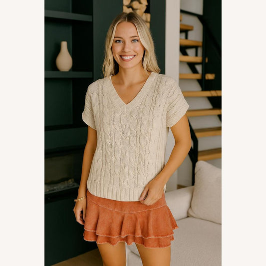 Women's Open Knit Top V-Neck Light and Loose – Textured Beige Sweater for Mid-Season