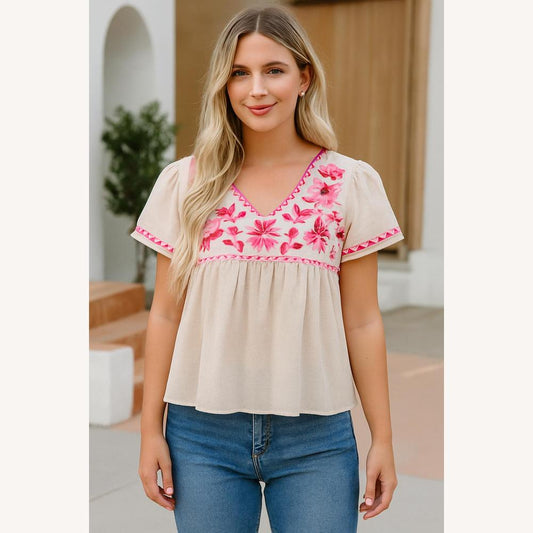 Women's Light Beige Blouse with Pink Floral Embroidery, V-Neck, Breathable Fabric – Ideal for Sunny Days