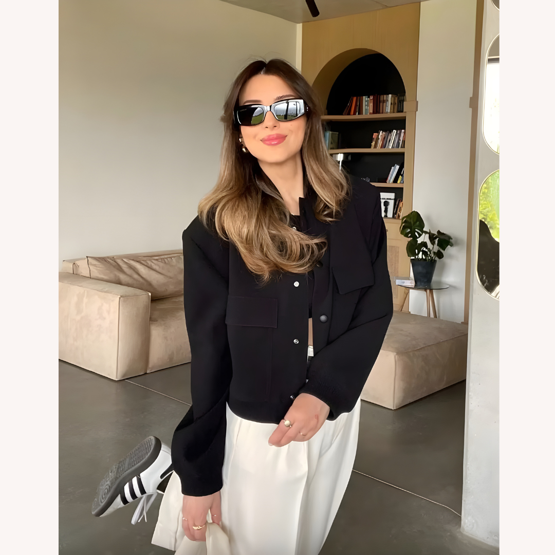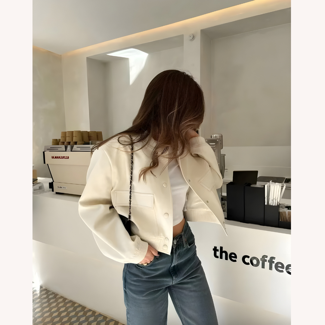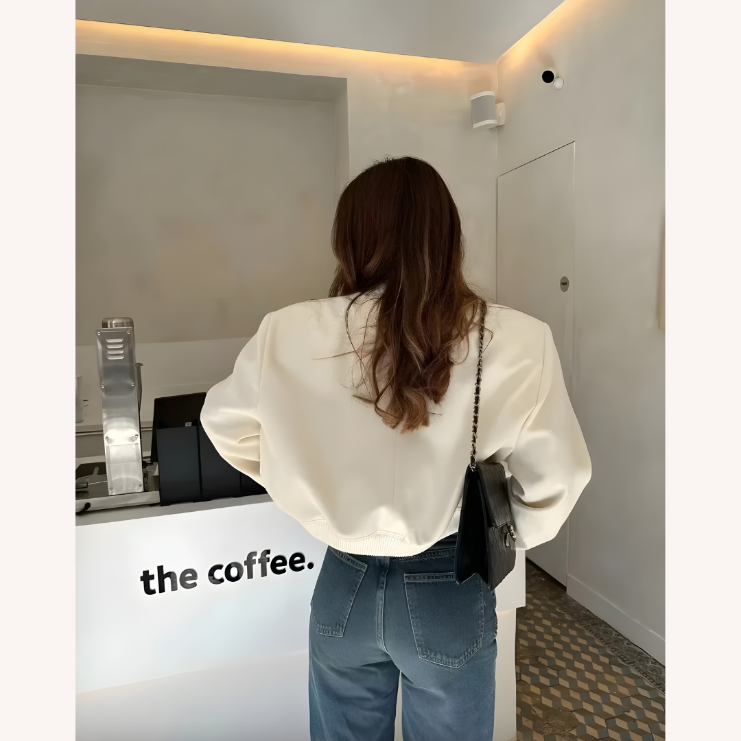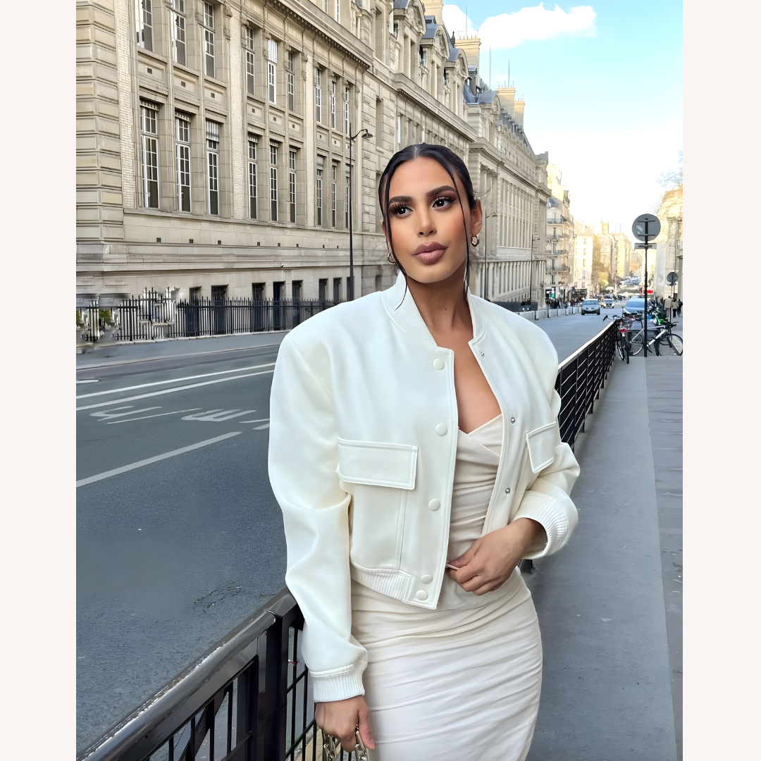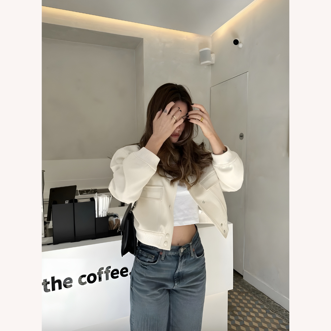 Discover the short jacket ideal for an urban and casual style. This white model, inspired by bomber style, combines lightness and trendiness. Its loose fit and soft material make it a must-have for mid-season, perfect for your city outings or coffee breaks.