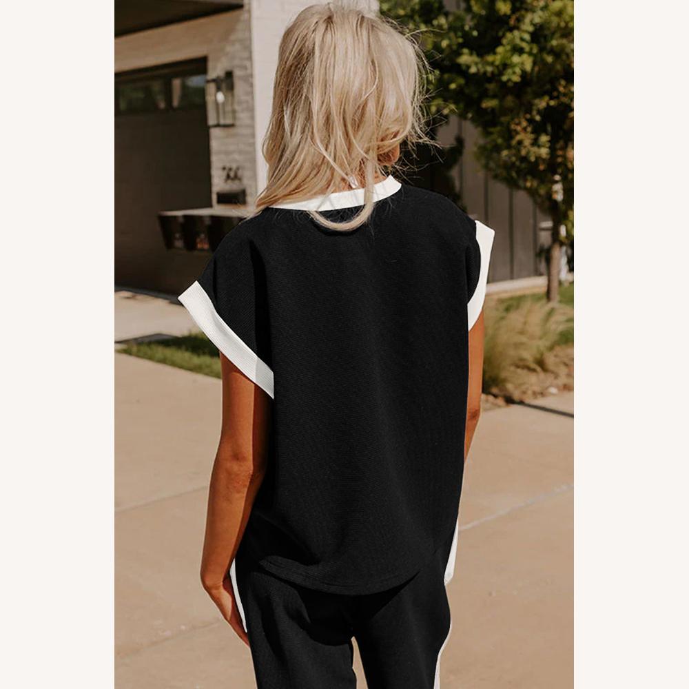 Women's Two-Piece Set Black with Loose Top and Wide-Leg Pants – White Contrasting Details