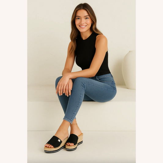 Women's Black Sandals Size 38 Stretch Fabric with Platform