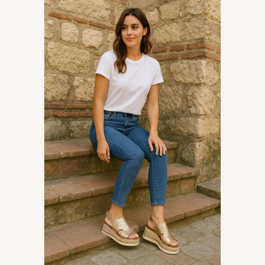 Women's Metallic Gold Sandals Size 38 PU Leather Wedge