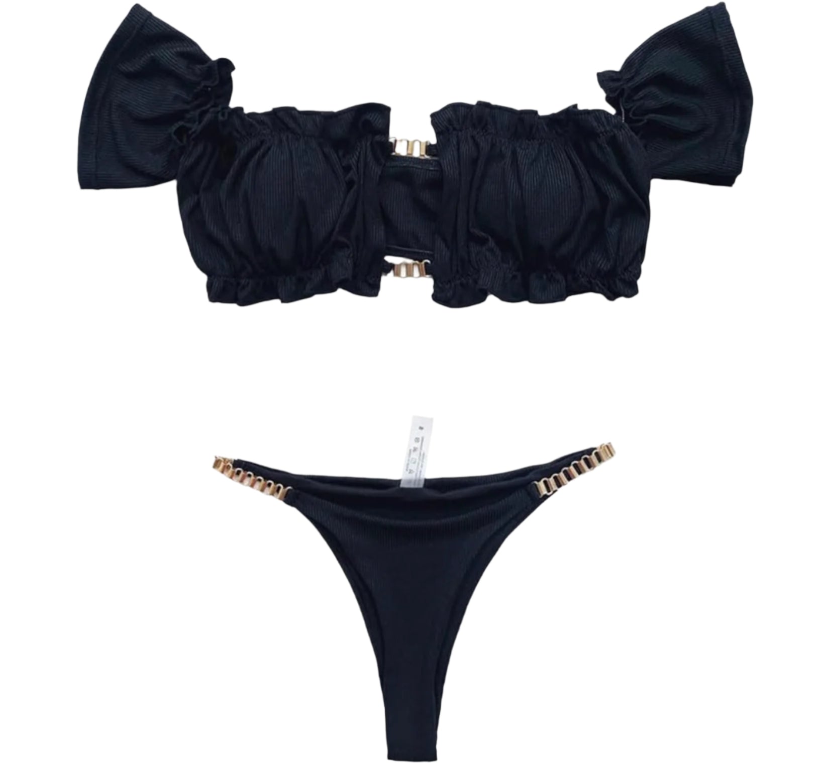 Discover the perfect bikini for summer, combining charm and sensuality. With its cut-out details and off-shoulder cut, this swimsuit transforms you into a true mermaid. The ruffle accents add a feminine touch, while the flattering cut highlights your silhouette. Whether for a day at the beach or a poolside party, this bikini is your ideal ally to shine under the sun.
