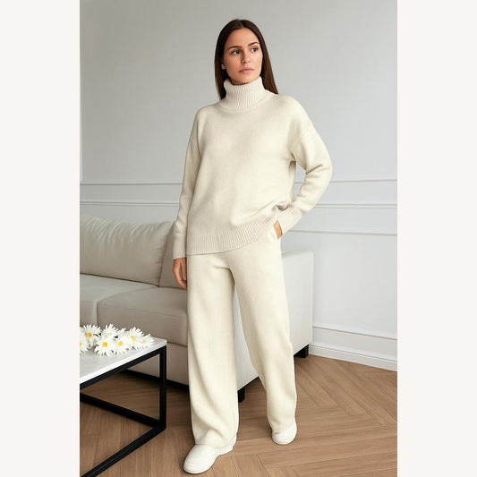 White Knit Lounge Set with Turtleneck Sweater and High-Waisted Wide-Leg Pants – Elegant Comfort for Women