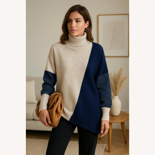 Women's Turtleneck Color Block Cozy Knit Sweater – Chic and Modern, Relaxed Fit, Perfect for Office or Casual Outings