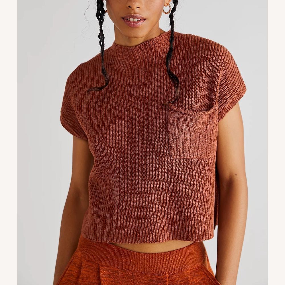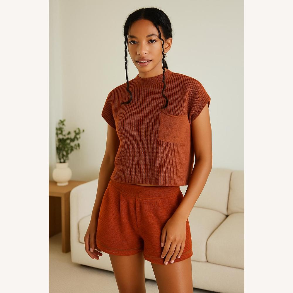 Discover the sleeveless cropped knit top, an essential piece for your casual wardrobe. With its ribbed texture and modern high neck, this top combines comfort and style. Its soft and breathable fabric makes it perfect to wear alone or layered, offering a trendy and relaxed look.