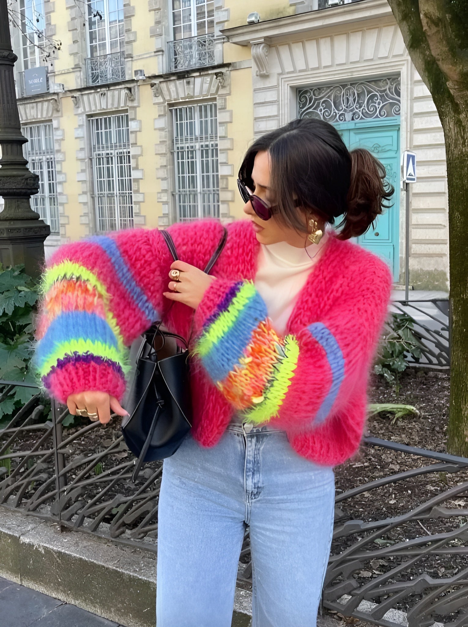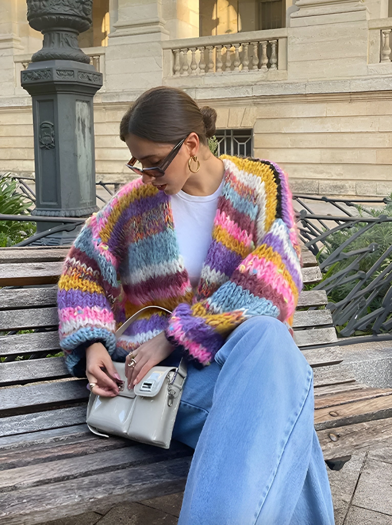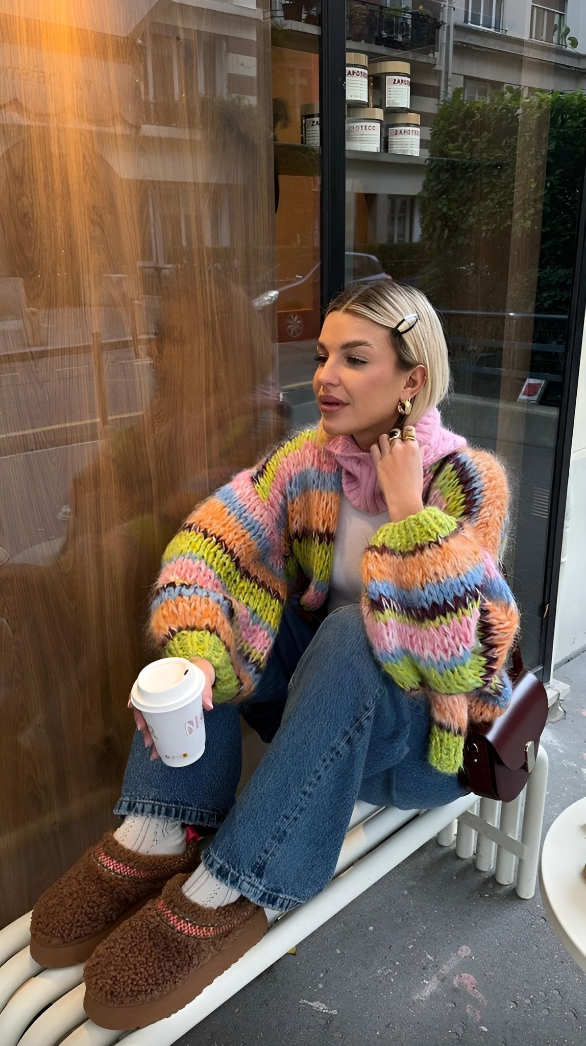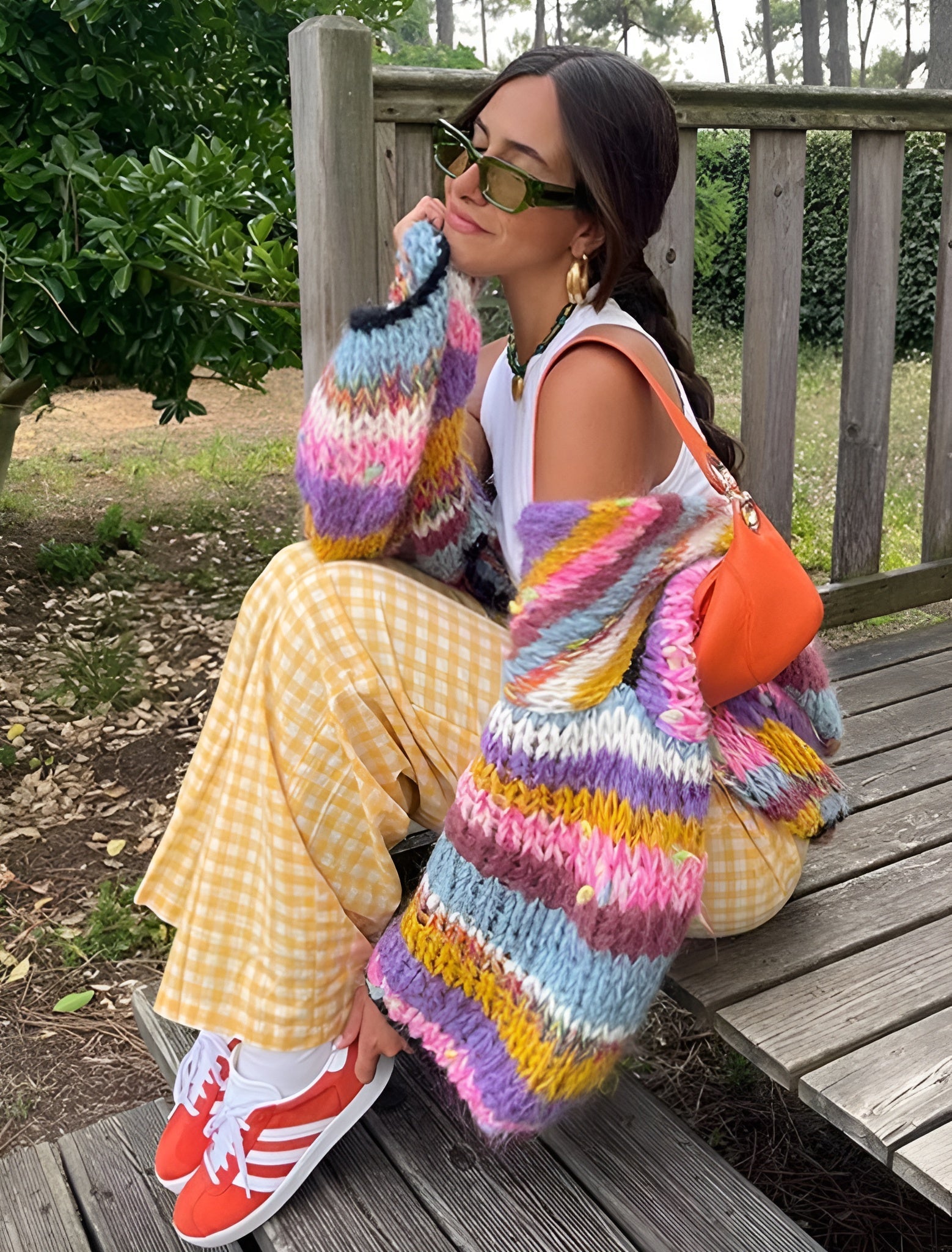 Discover this chunky knit vest, perfect for adding a splash of color to your outfits. With its multicolored stripe design and hand-knitted effect, this vest combines comfort and style, ideal for cool days. Its soft and warm texture makes it a perfect choice for mid-season, whether for a casual outing or a stylish urban look.
